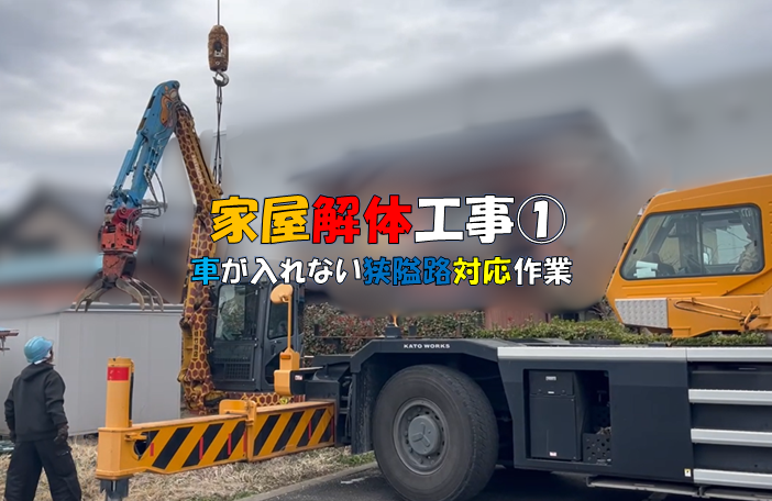 - 【施工事例】車が入らない狭隘路でも諦めない!クレーン揚重による重機搬入と解体工事