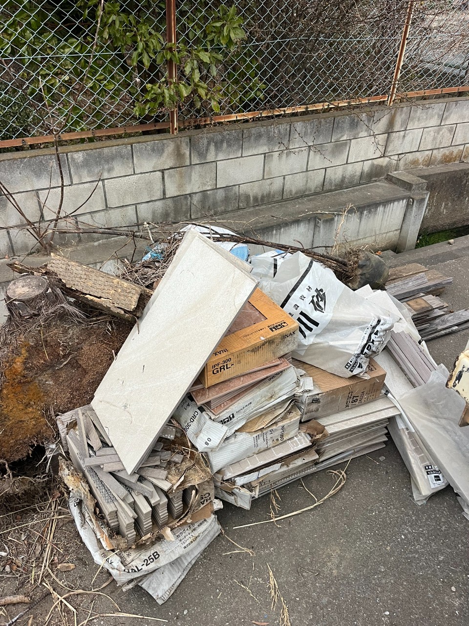 段ボールや建築残材、タイル類などを分別し、一括搬出いたしました。