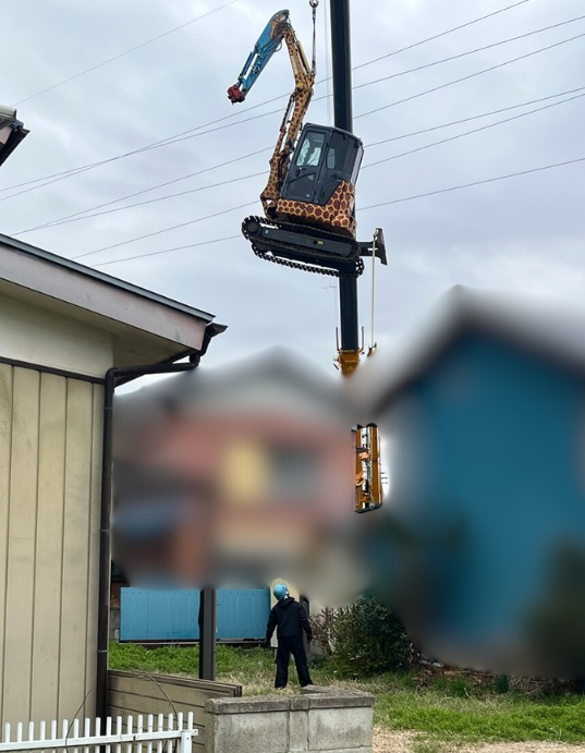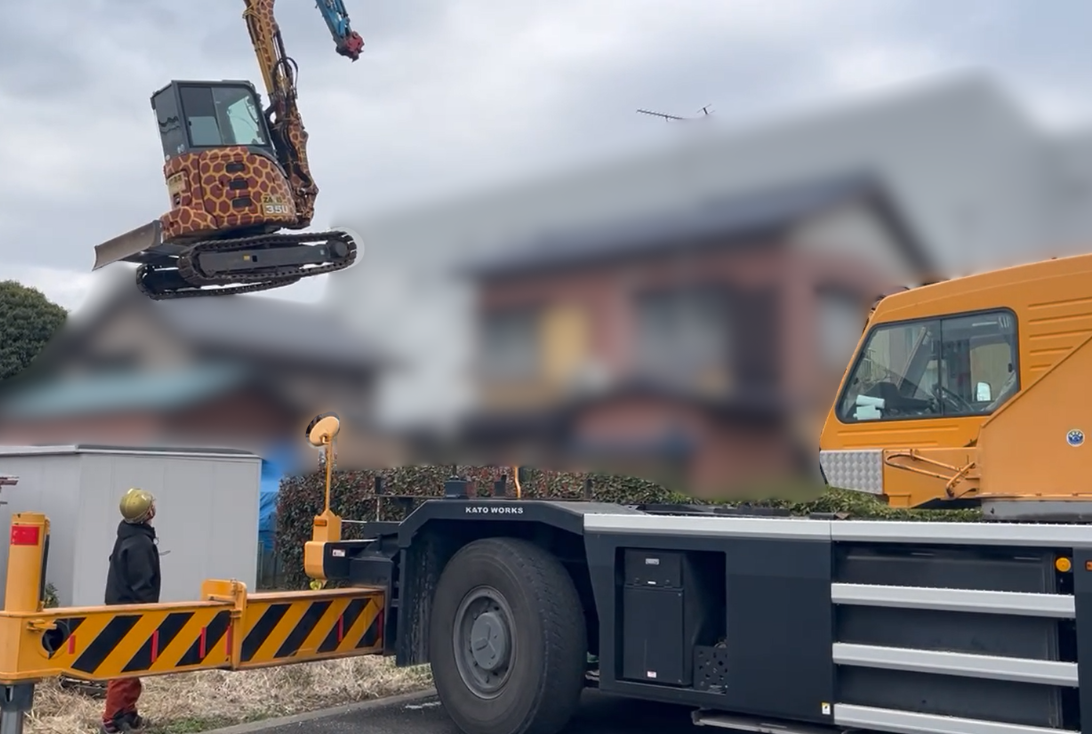 近隣の皆様にご協力と安全へのご理解をいただき、住宅の上空を慎重に通過させて重機(ショベルカー)を現場内へ搬入いたしました。